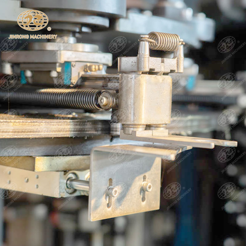 全自動旋轉式吹瓶機,有進坯斗、上料機構、 理坯機構、下料機構、進坯盤、加熱器、出坯盤組成的加熱系統(tǒng),由合模機構、拉伸氣缸、封口氣缸組成的拉吹機。吹瓶設備特征在于所述的加熱系統(tǒng)和拉吹機安裝在同一臺機座上,電箱安裝在機座內(nèi)的右后角,進坯斗、上料機構、 理坯機構、下料機構安置在電箱和加熱器之間。拉吹機是四個工位,在四個工位的拉吹機旁安裝一個取坯夾手機構和一個取瓶夾手機構,在取坯夾手機構和取瓶夾手機構中分別有兩個取坯機械手和兩個取瓶機械手。實用新型旋轉式吹瓶機,布局非常緊湊,節(jié)約了占用空間,縮短了傳遞間距,大大降低成本,并且整機為一整體,吊裝、運輸時無需拆分。